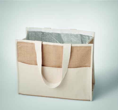 This jute shopping and cooler bag has long handles, a laminated interior for keeping things fresh and a hook and loop closure. The front has a canvas pocket and cotton webbing for smaller items. This jute bag is perfect for daily grocery shopping. This jute bag has a long lifespan which makes it a great alternative to disposable, plastic bags.