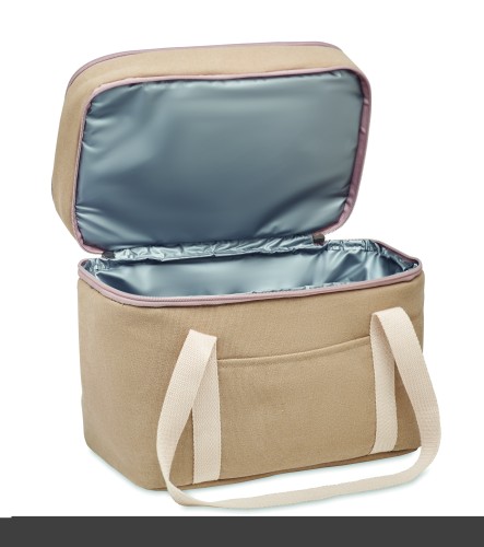 Cooler bag with 2 compartments in washed canvas with cotton strap. 320 gr/m². Insulation: 15C PEVA with 6mm PE foam.