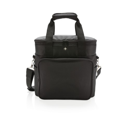 Deluxe 1680D and 600D polyester cooler bag with extra-large zipped main compartment and front sleeved pocket. Fits up to 20 cans. Double reinforced carrying handles. Removable adjustable shoulder strap.