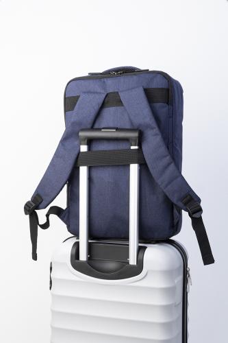 Dual function RPET backpack and document bag with zipped compartment and padded laptop (15") compartment. With trolley strap, padded back and shoulder straps. 300D RPET polyester, with distinctive RPET label.