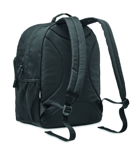 15 inch laptop backpack in 300D RPET polyester. It has 2 large zippered compartments, double zippered front pockets and mesh side pocket. Padded back, bottom and shoulder straps.