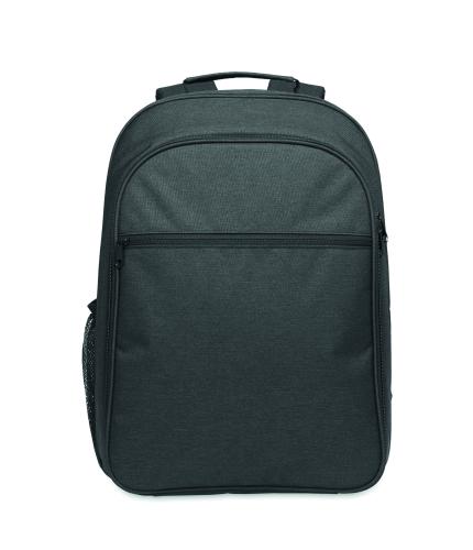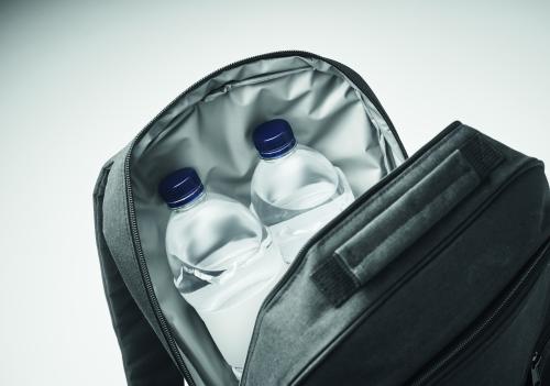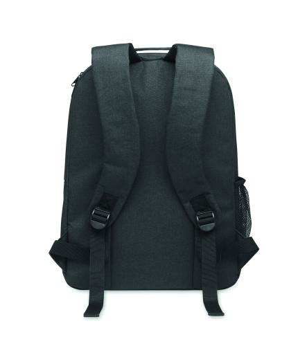 300D RPET cooling backpack with 15 inch laptop compartment. Front zipper pocket and one side mesh compartment.