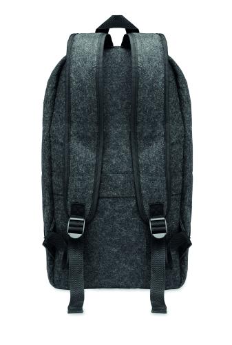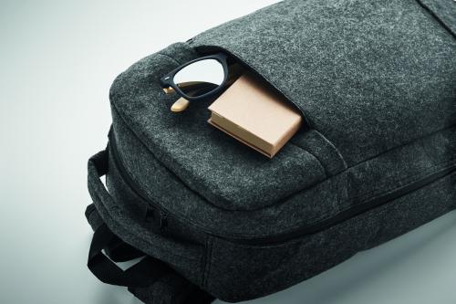 13 inch laptop backpack in RPET felt with padded shoulder and strap with a main internal compartment. Zippered compartment inside. Trolley holder on reverse side.