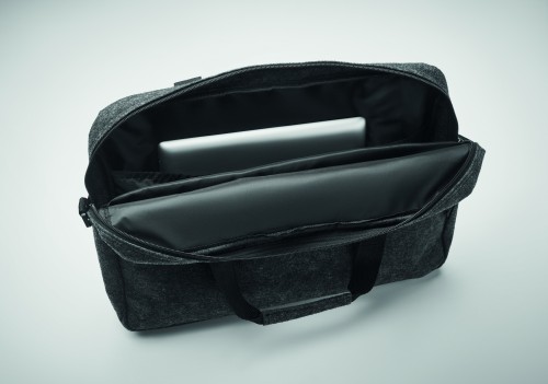 15 inch laptop bag in RPET felt including one main internal compartment and one zippered front pocket. Includes detachable and adjustable shoulder strap. Trolley holder on reverse side.