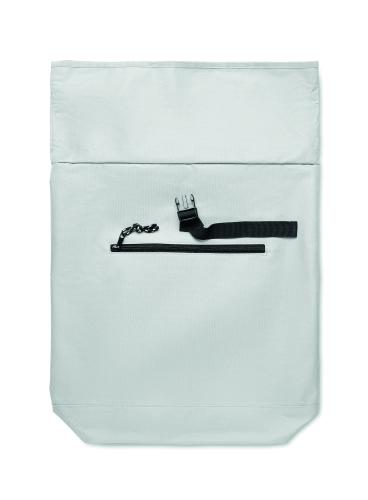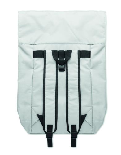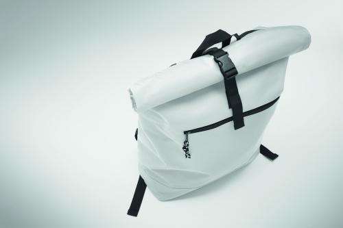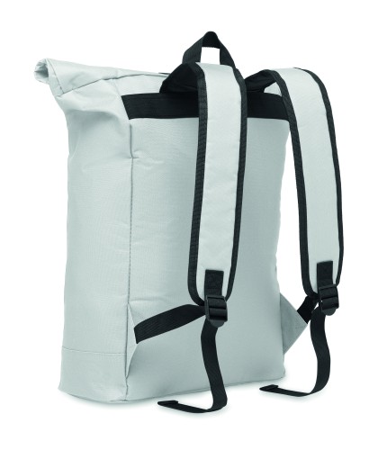 15 inch rolltop laptop backpack in 600D polyester with padded back and base reinforcement. Zippered front pocket. 210D lining.