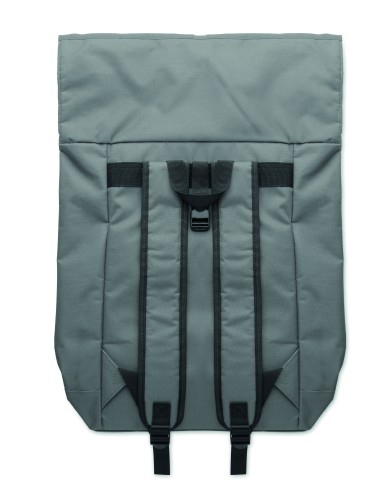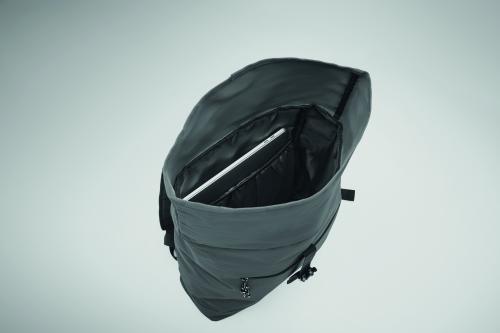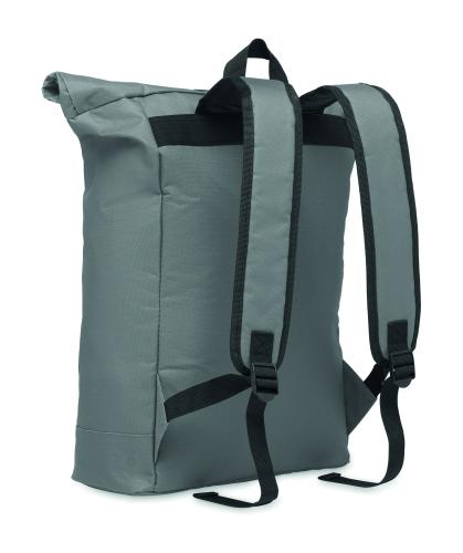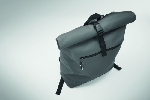 15 inch rolltop laptop backpack in 600D polyester with padded back and base reinforcement. Zippered front pocket. 210D lining.