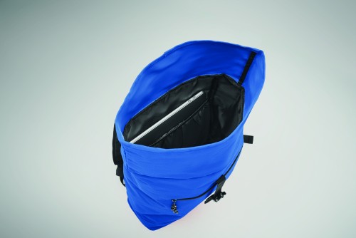 15 inch rolltop laptop backpack in 600D polyester with padded back and base reinforcement. Zippered front pocket. 210D lining.