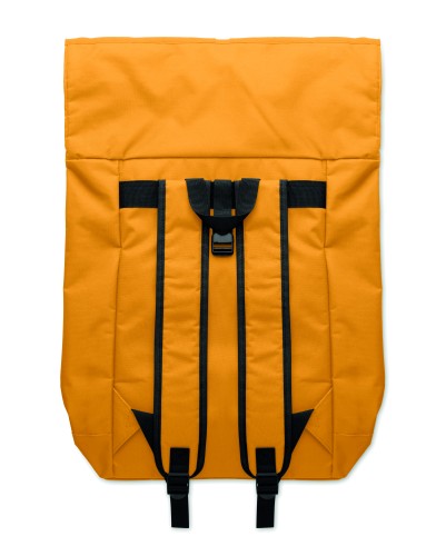 15 inch rolltop laptop backpack in 600D polyester with padded back and base reinforcement. Zippered front pocket. 210D lining.