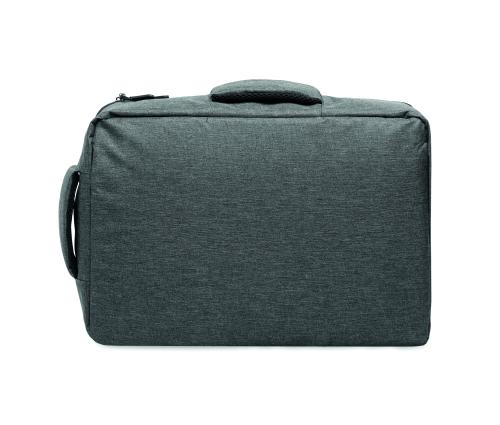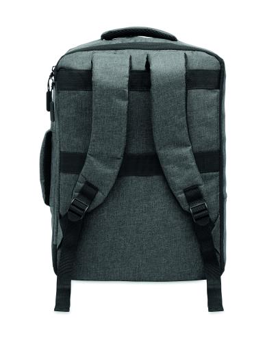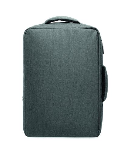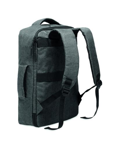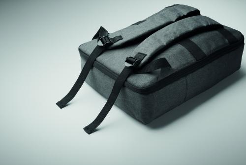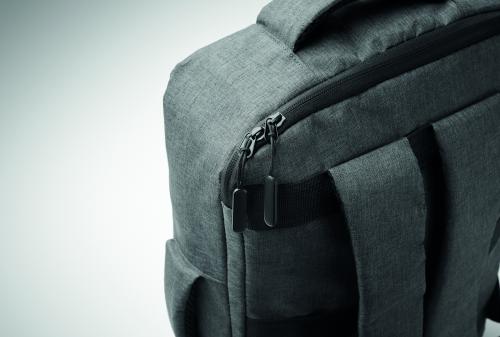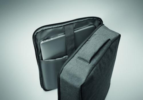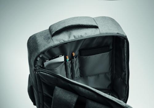 Slim 15 inch laptop backpack in 300D RPET with safe 180 degree opening with 210D RPET lining. Includes laptop compartment, 2 internal slip pockets, 2 internal pen pockets and 2 padded carry handles. Soft padded back and shoulder straps. Suitcase sleeve.