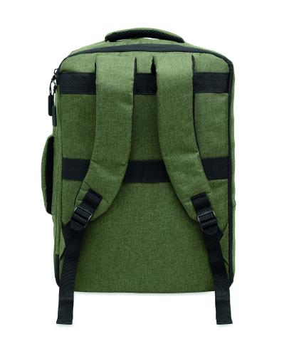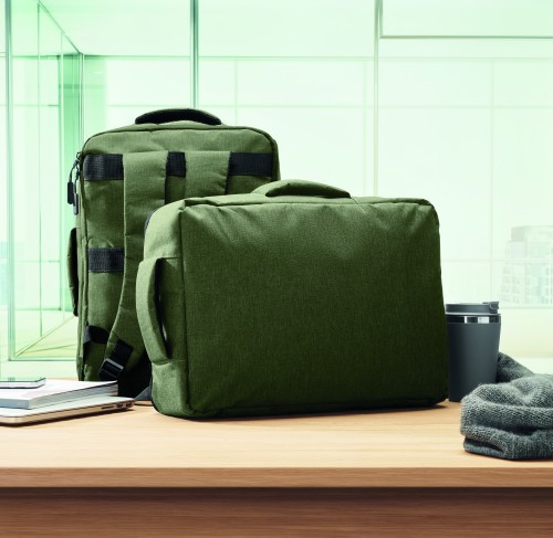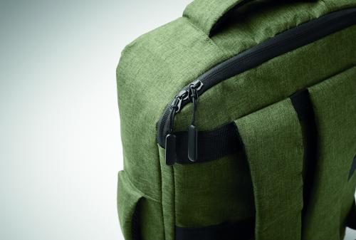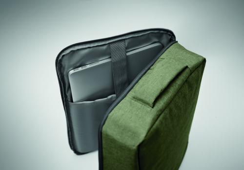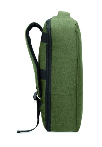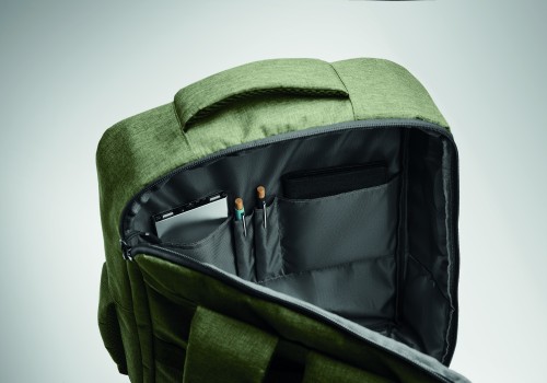 Slim 15 inch laptop backpack in 300D RPET with safe 180 degree opening with 210D RPET lining. Includes laptop compartment, 2 internal slip pockets, 2 internal pen pockets and 2 padded carry handles. Soft padded back and shoulder straps. Suitcase sleeve.