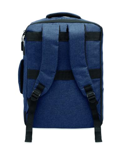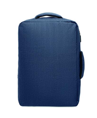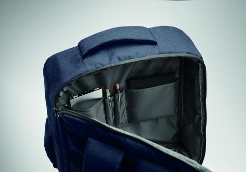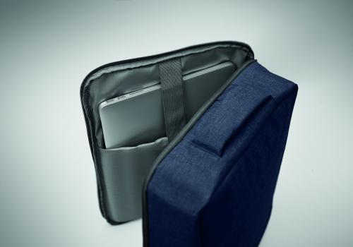 Slim 15 inch laptop backpack in 300D RPET with safe 180 degree opening with 210D RPET lining. Includes laptop compartment, 2 internal slip pockets, 2 internal pen pockets and 2 padded carry handles. Soft padded back and shoulder straps. Suitcase sleeve.