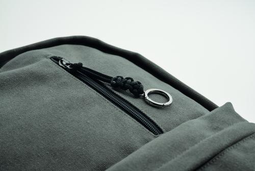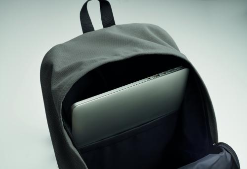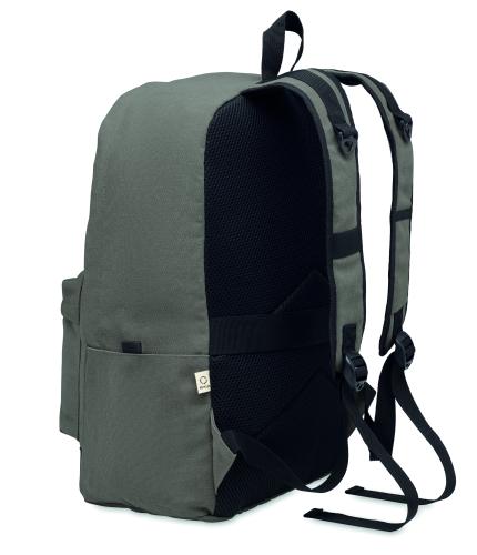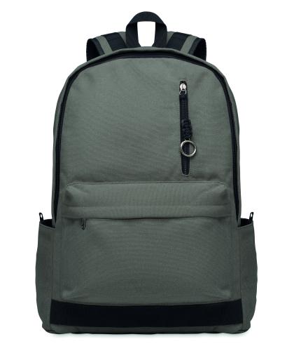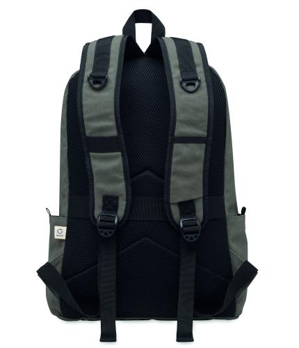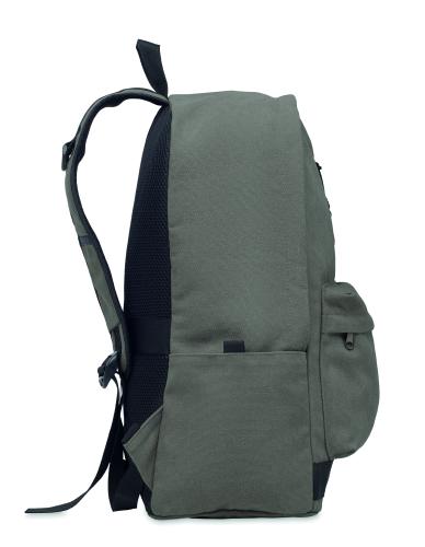 15inch laptop backpack in recycled washed canvas. Large front zippered pocket with inner laptop compartment. Small front zippered pocket. Two side-slip pockets. Padded back and shoulder straps, back panel and base. 450 gr/m².