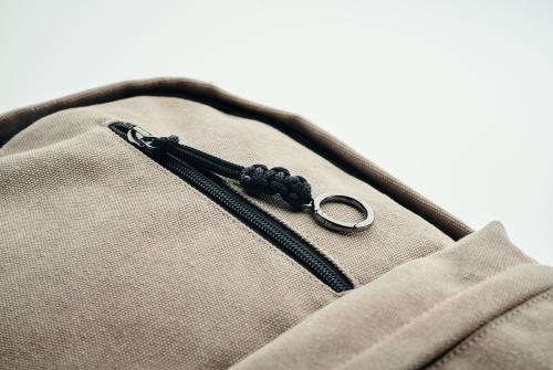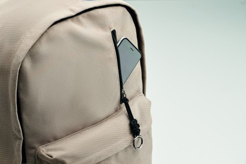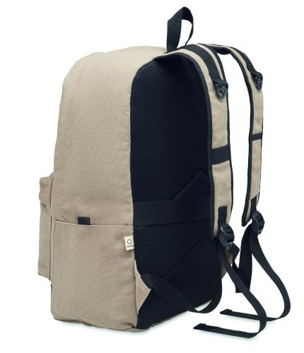 15inch laptop backpack in recycled washed canvas. Large front zippered pocket with inner laptop compartment. Small front zippered pocket. Two side-slip pockets. Padded back and shoulder straps, back panel and base. 450 gr/m².