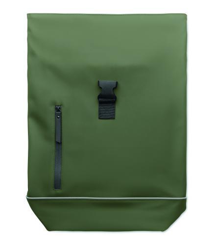 15 inch roll top laptop backpack in soft PU with padded back and base reinforcement with reflective strip. Waterproof zippered front pocket. 210D RPET polyester lining.