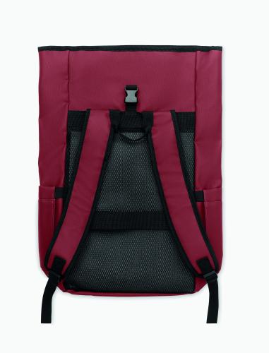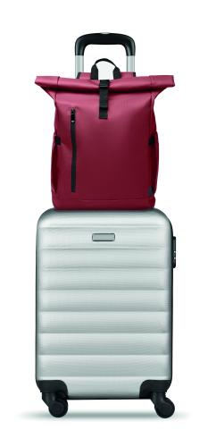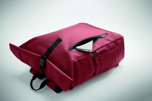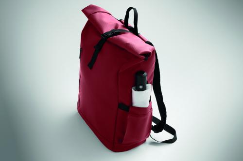 Roll top 15 inch laptop backpack in PU coated 600D RPET polyester and RPET polyester lining. Meshed padded back with zippered pocket and trolley strap. Padded shoulder strap with mesh inside finishing.
