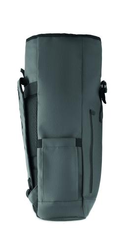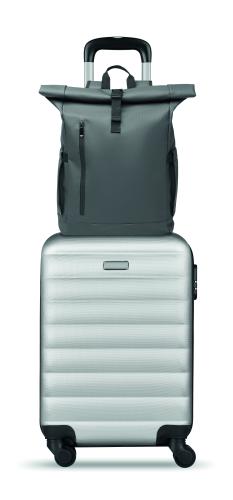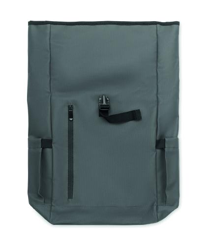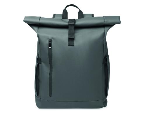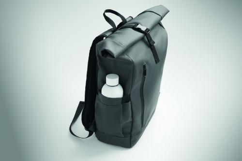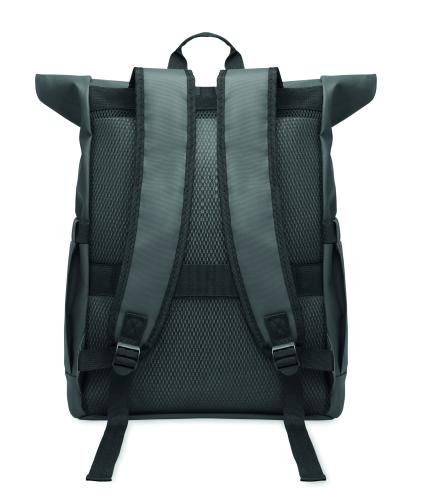 Roll top 15 inch laptop backpack in PU coated 600D RPET polyester and RPET polyester lining. Meshed padded back with zippered pocket and trolley strap. Padded shoulder strap with mesh inside finishing.