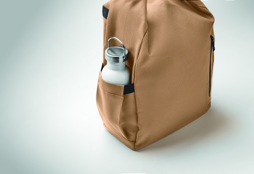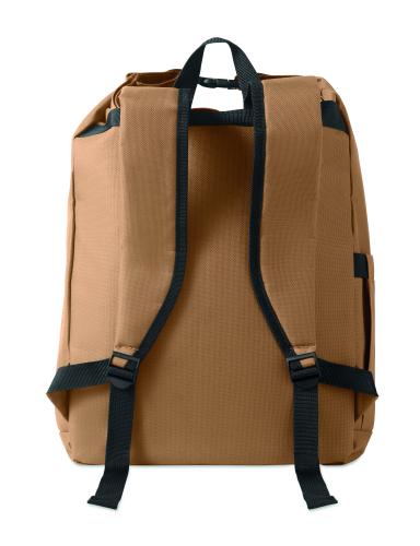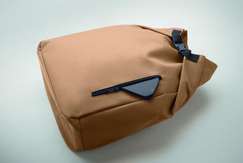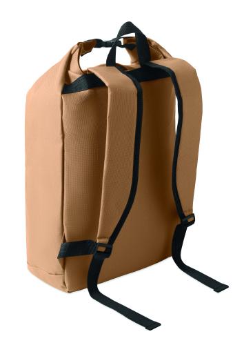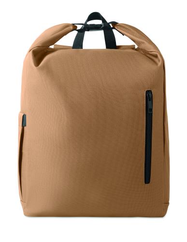 15-inch roll top laptop backpack made of 600D RPET polyester with 210D RPET padded lining. Features a zippered front pocket, elastic side pocket, and adjustable shoulder straps.