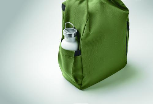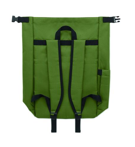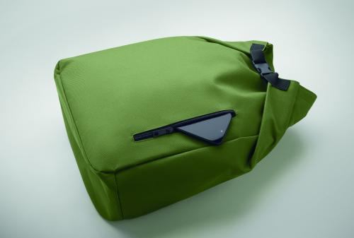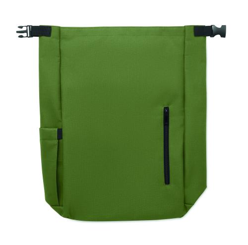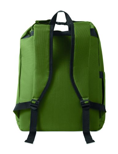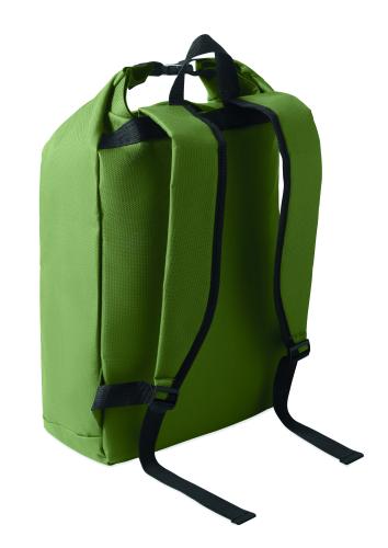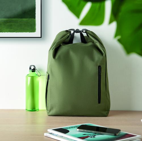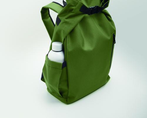 15-inch roll top laptop backpack made of 600D RPET polyester with 210D RPET padded lining. Features a zippered front pocket, elastic side pocket, and adjustable shoulder straps.