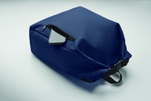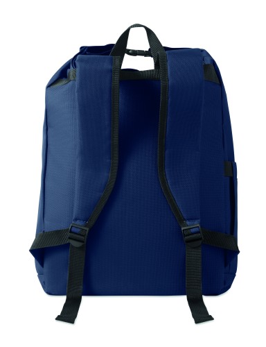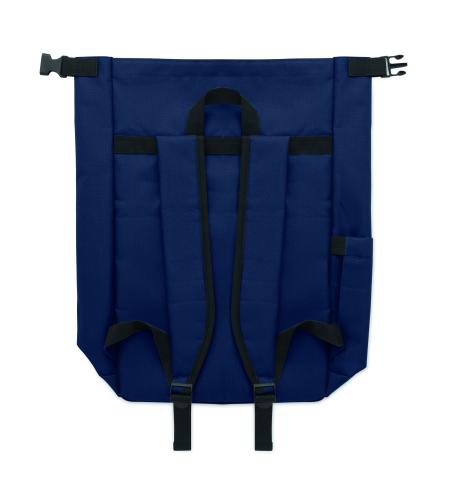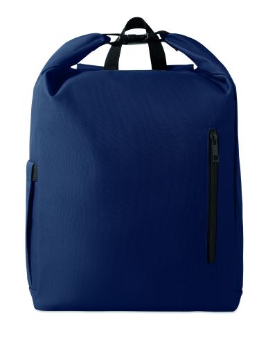 15-inch roll top laptop backpack made of 600D RPET polyester with 210D RPET padded lining. Features a zippered front pocket, elastic side pocket, and adjustable shoulder straps.