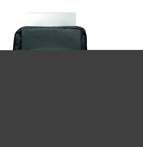 Laptop backpack in 300D RPET Polyester with padded shoulder strap including one main internal compartment for 16 inch laptop and a USB charging cable.