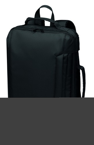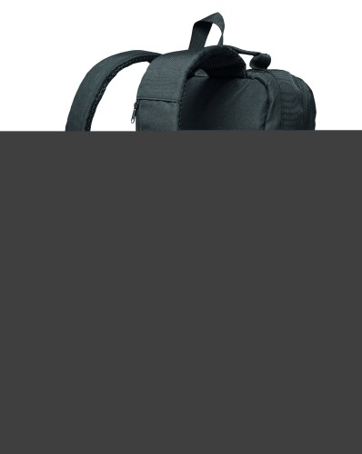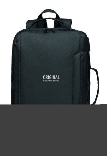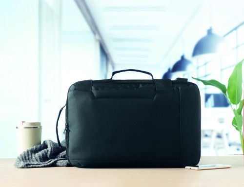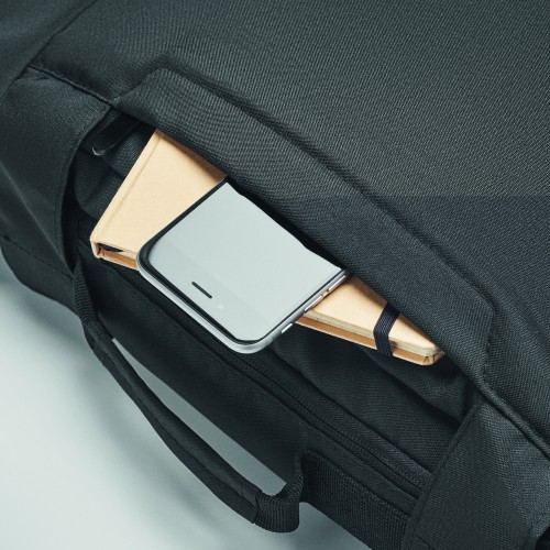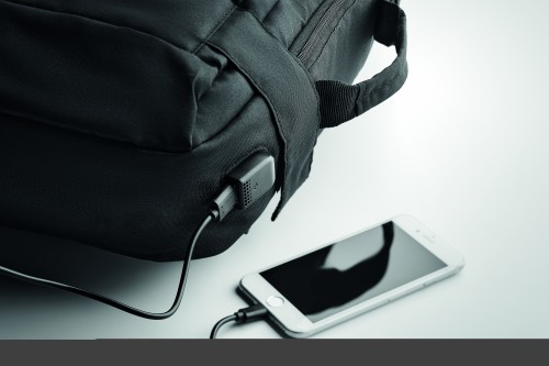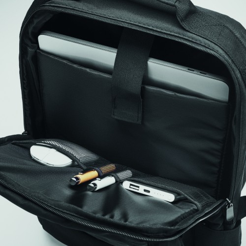 Laptop backpack in 300D RPET Polyester with padded shoulder strap including one main internal compartment for 16 inch laptop and a USB charging cable.