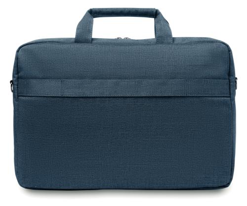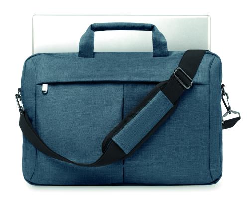 Laptop bag in 360D 2 tone polyester including one main internal compartment for 15 inch laptop and one zippered front pocket. Includes detachable and adjustable shoulder strap. Trolley holder on back side.