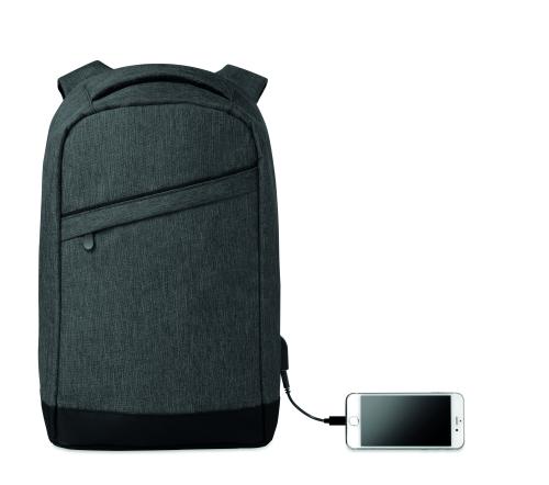 600D 2 tone Polyester backpack with padded shoulder strap with main internal compartment. Includes one internal 13'' laptop compartment and an USB charging cable. Zipper main compartment on backside for better protection.