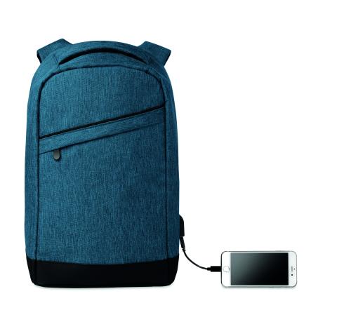 600D 2 tone Polyester backpack with padded shoulder strap with main internal compartment. Includes one internal 13'' laptop compartment and an USB charging cable. Zipper main compartment on backside for better protection.