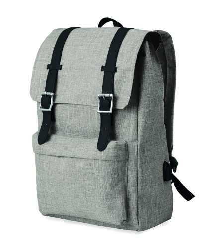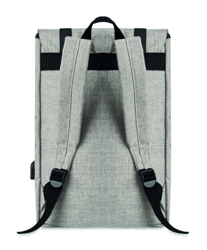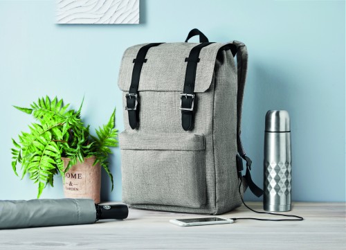 Laptop backpack in 600D 2 tone polyester with padded shoulder strap including one main internal compartment for 15 inch laptop and a USB charging cable. Includes magnetic snap button closure and one zippered front compartment.