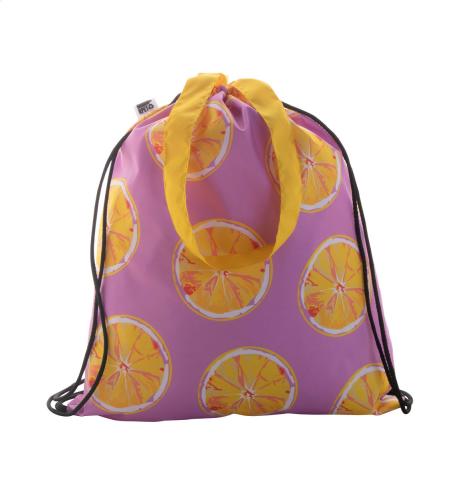 Custom made drawstring bag with coloured strings and long handles, 190T RPET polyester. It can be also used as a shopping bag. With all over sublimation printed graphics and distinctive RPET label. MOQ: 25 pcs.