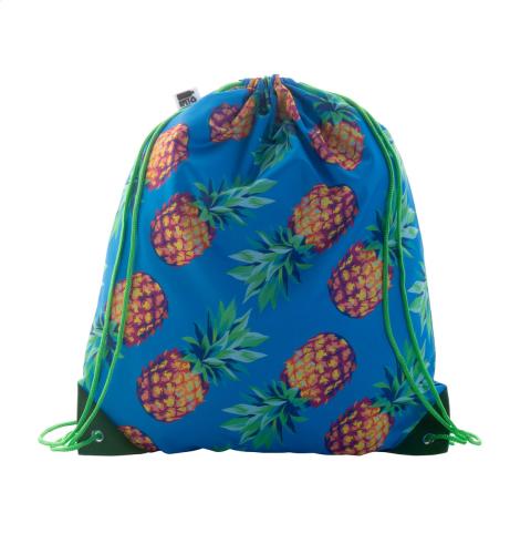 Custom made drawstring bag with reinforced PU leather corners and matching colour strings, 190T RPET polyester. With all over sublimation printed graphics and distinctive RPET label. MOQ: 25 pcs.