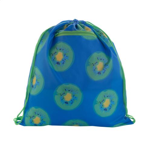 Custom made drawstring bag with zipped, RFID protected front pocket, 190T polyester. With all over sublimation printed graphics. MOQ: 25 pcs.
