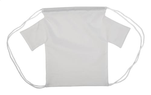 Custom made, T-shirt shaped drawstring bag with coloured strings, 190T polyester. With all over sublimation printed graphics. MOQ: 25 pcs.