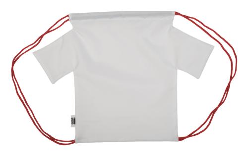 Custom made, T-shirt shaped drawstring bag with coloured strings, 190T RPET polyester. With all over sublimation printed graphics and distinctive RPET label. MOQ: 25 pcs.