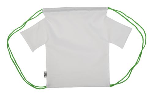 Custom made, T-shirt shaped drawstring bag with coloured strings, 190T RPET polyester. With all over sublimation printed graphics and distinctive RPET label. MOQ: 25 pcs.
