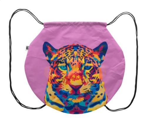 Custom made, ball shaped drawstring bag with coloured strings, 190T RPET polyester. With all over sublimation printed graphics and distinctive RPET label. MOQ: 25 pcs.