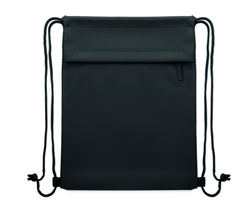 Drawstring bag with PU coated 600D RPET polyester and 190T RPET polyester lining. Zippered front pocket.