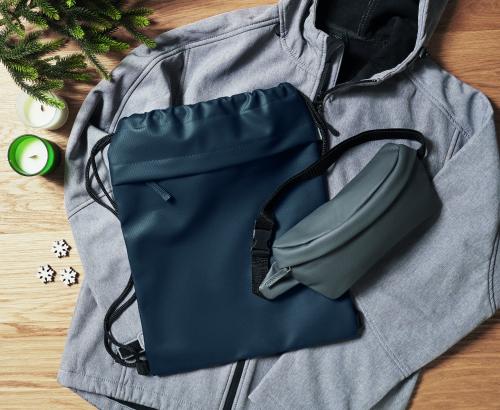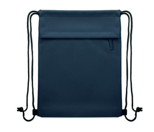 Drawstring bag with PU coated 600D RPET polyester and 190T RPET polyester lining. Zippered front pocket.