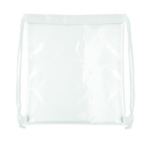 Transparent drawstring bag in EVA and PVC. Polyester cords.