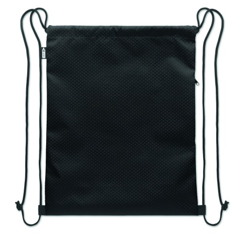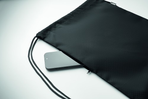 Drawstring bag in 420D RPET polyester with vertical side zip pocket and RPET 210D lining. Features durable cords on both sides. Capacity 4.5L, max load 5 kg.