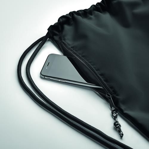 Large drawstring bag in 300D RPET polyester with side zippered outer pocket.