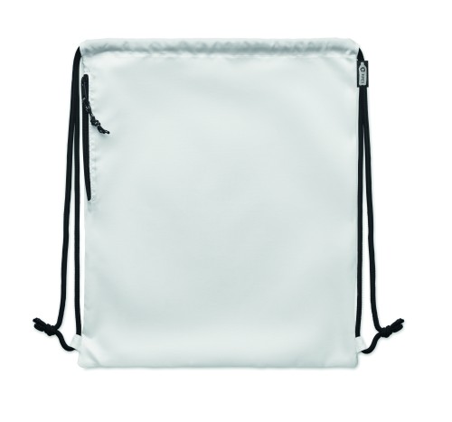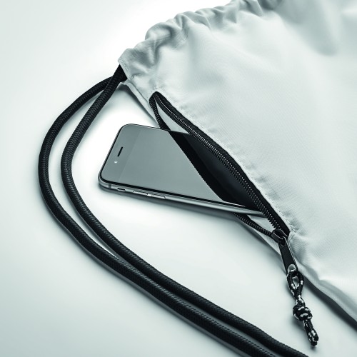 Large drawstring bag in 300D RPET polyester with side zippered outer pocket.