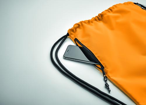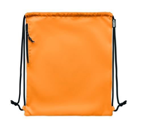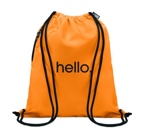 Large drawstring bag in 300D RPET polyester with side zippered outer pocket.