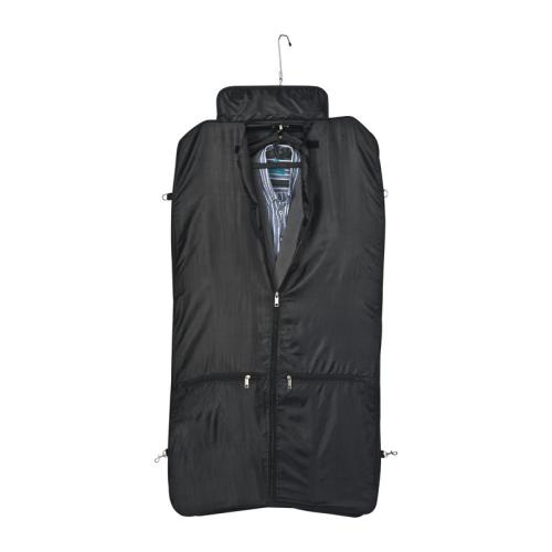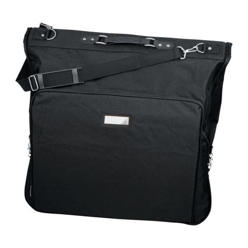 Big and sturdy polyester suit carrier with shoulder straps, carrying handle, additional compartments and subtle metal plate on a label made of artificial leather.