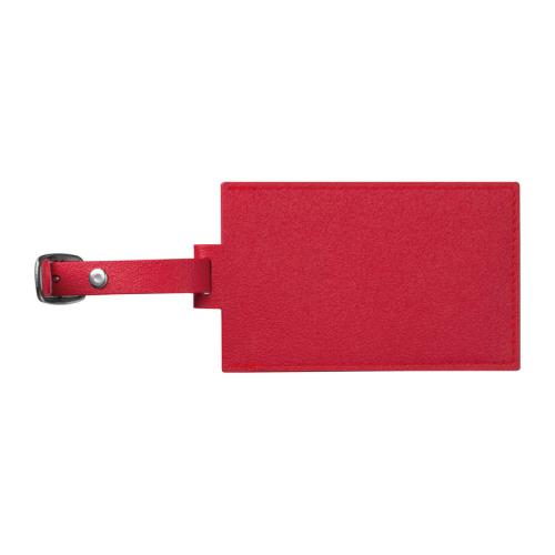 Luggage tag made of water-repellent PU material, belt loop for fastening and address field window that can be closed with a press stud.