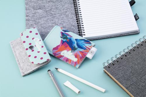 Custom made, RPET felt purse with full colour printed flap and back side. With distinctive RPET label. Price includes sublimation printing. MOQ: 50 pcs.
