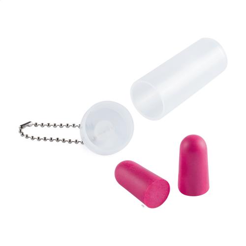 Coloured EVA earplugs, in transparent plastic case with metal chain.