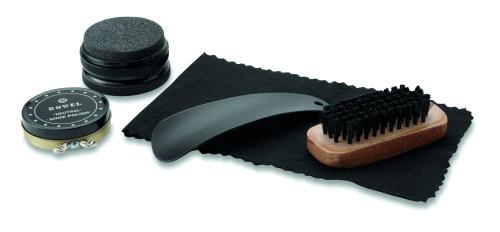 5 pieces luxurious shoe polish kit in gift box. This set includes a black shoe cloth, a black shoe horn, a wooden shoe brush, a shoe shine spongy and polish in a neutral colour.