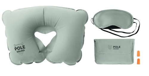 Travel set including a velvet inflatable pillow, eye mask and earplugs. All packed in a velvet pouch.