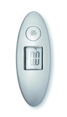 Luggage scale in ABS casing. Maximum capacity measure: 40 kg. Unit measure in kilogram or pounds. Powered by 1 cell battery included. Individual packaging in silver carton box.